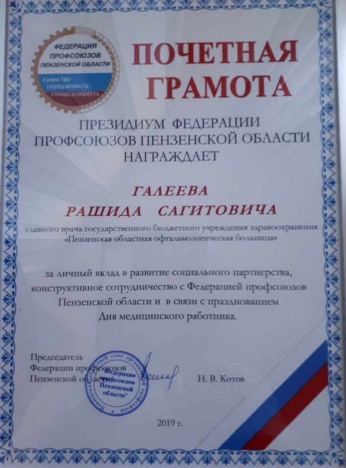 В канун Дня медицинского работника главный врач ГБУЗ «Пензенская областная офтальмологическая больница» Галеев Рашид Сагитович за личный вклад в развитие социального партнерства и конструктивное сотрудничество был награжден Почетной грамотой Федерации профсоюзов Пензенской области.